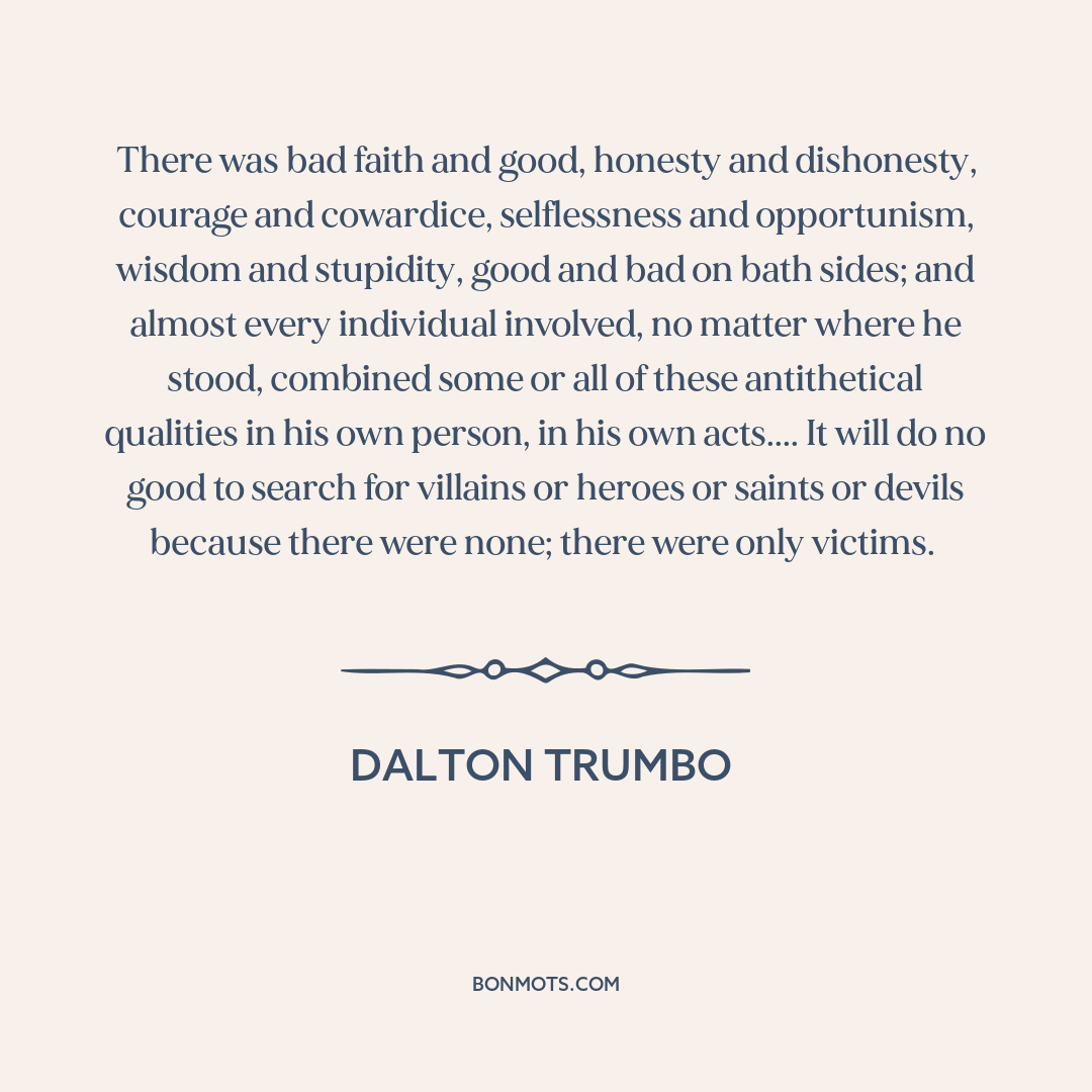 There was bad faith and good, honesty and dishonesty, courage and cowardice, selflessness and opportunism, wisdom and stupidity, good and bad on bath sides; and almost every individual involved, no matter where he stood, combined some or all of these antithetical qualities in his own person, in his own acts.... It will do no good to search for villains or heroes or saints or devils because there were none; there were only victims.