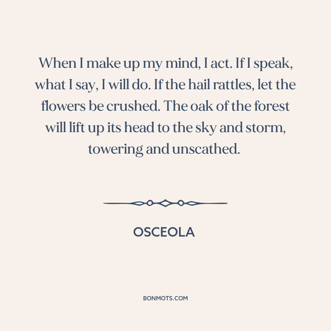 When I make up my mind, I act. If I speak, what I say, I will do. If the hail rattles, let the flowers be crushed. The oak of the forest will lift up its head to the sky and storm, towering and unscathed.