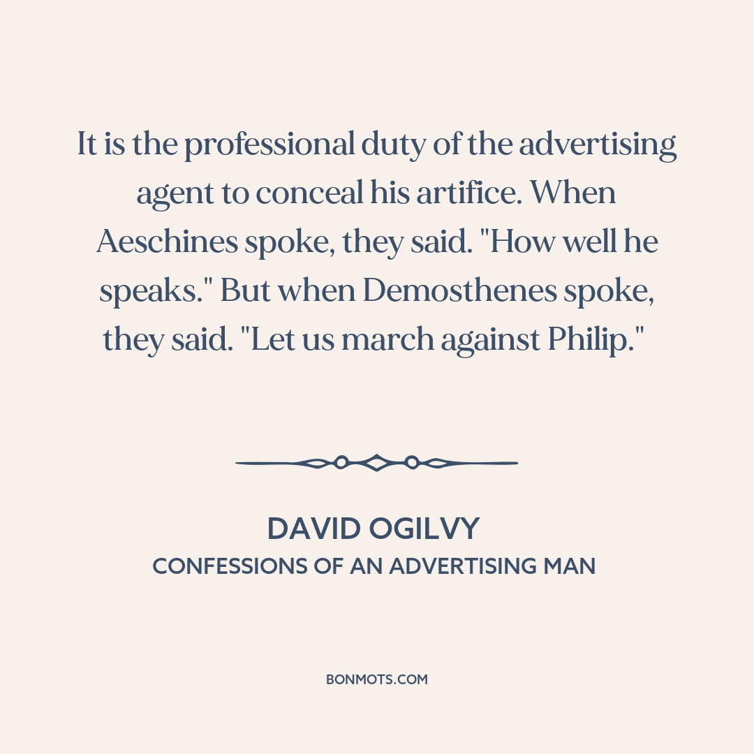 It is the professional duty of the advertising agent to conceal his artifice. When Aeschines spoke, they said. "How well he speaks." But when Demosthenes spoke, they said. "Let us march against Philip."