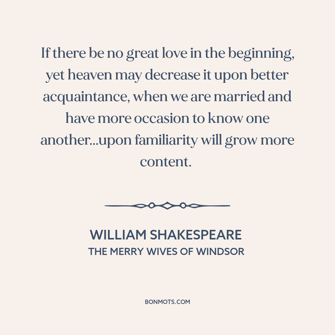 If there be no great love in the beginning, yet heaven may decrease it upon better acquaintance, when we are married and have more occasion to know one another...upon familiarity will grow more content.