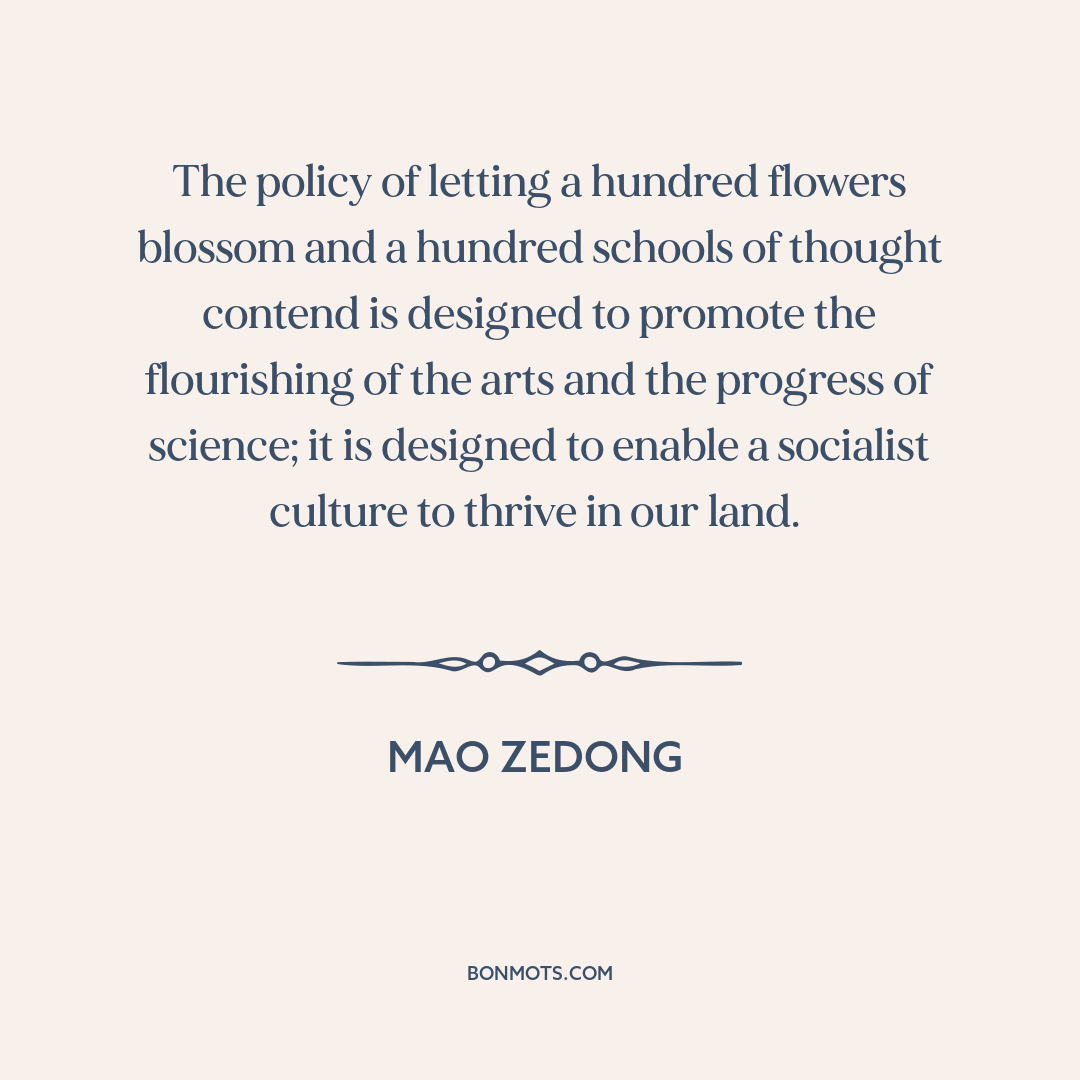 The policy of letting a hundred flowers blossom and a hundred schools of thought contend is designed to promote the flourishing of the arts and the progress of science; it is designed to enable a socialist culture to thrive in our land.