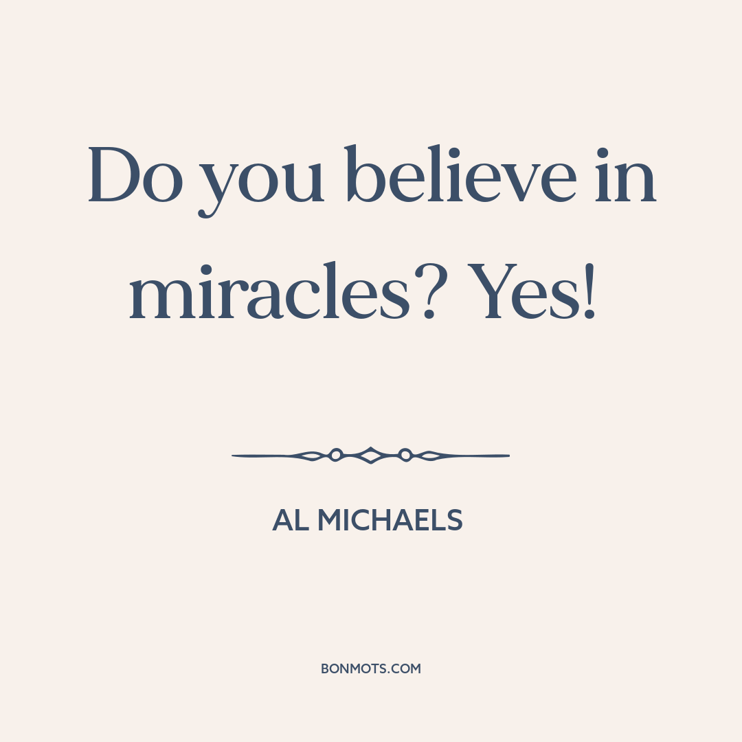 Michaels, Al. Spoken at the conclusion of victory by U.S. Olympic ice hockey team. 24 Feb. 1980, Olympic Fieldhouse, Olympic Arena, Lake Placid, NY, USA. ABC television broadcast.