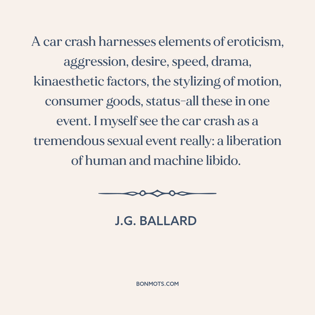 A car crash harnesses elements of eroticism, aggression, desire, speed, drama, kinaesthetic factors, the stylizing of motion, consumer goods, status-all these in one event. I myself see the car crash as a tremendous sexual event really: a liberation of human and machine libido.