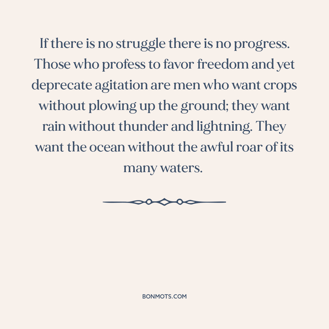 If there is no struggle there is no progress. Those who profess to favor freedom and yet deprecate agitation are men who want crops without plowing up the ground; they want rain without thunder and lightning. They want the ocean without the awful roar of its many waters.