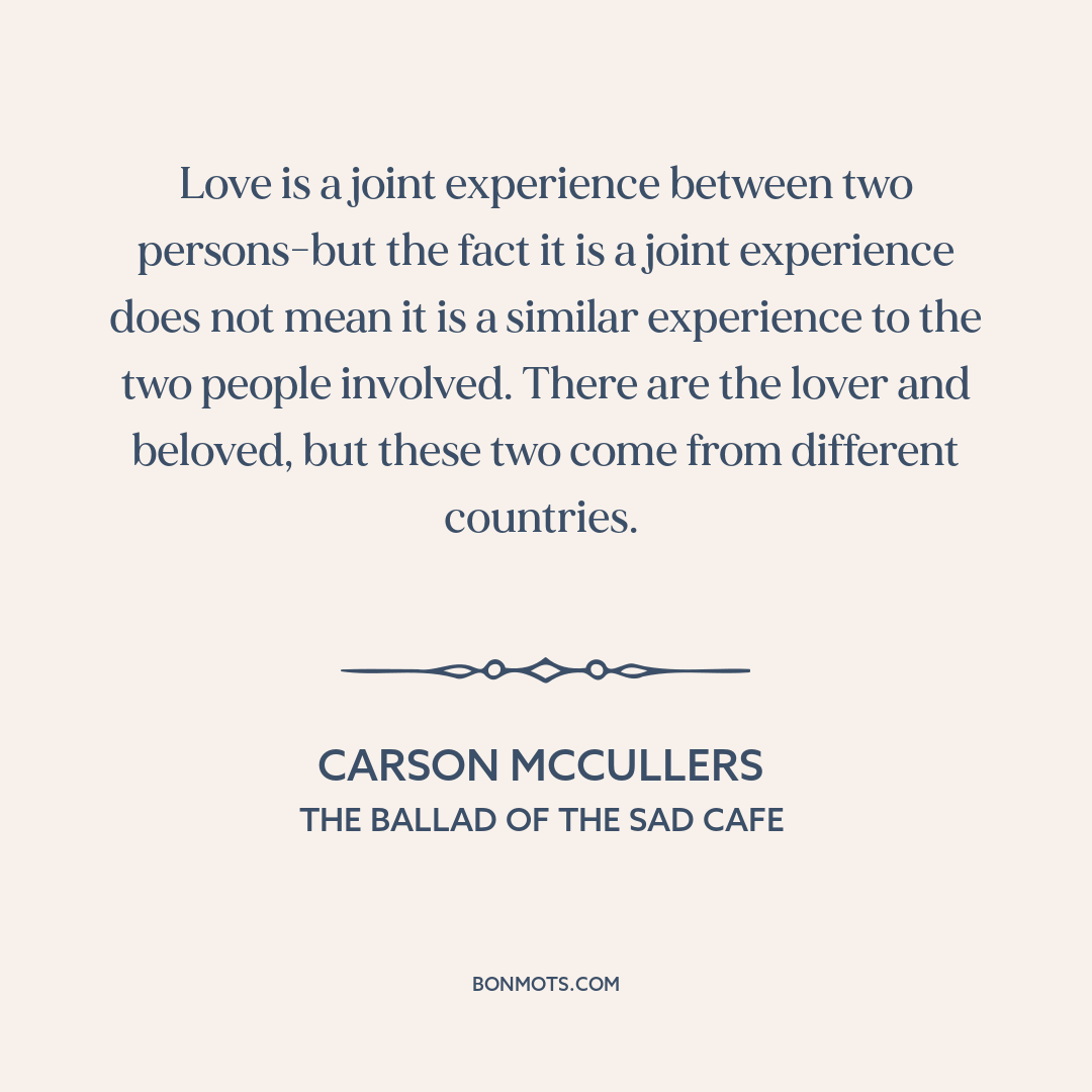 Love is a joint experience between two persons-but the fact it is a joint experience does not mean it is a similar experience to the two people involved. There are the lover and beloved, but these two come from different countries.