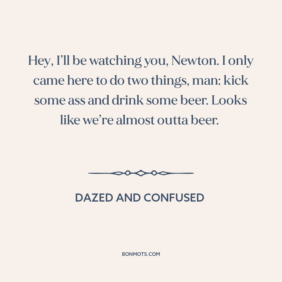 Hey, I’ll be watching you, Newton. I only came here to do two things, man: kick some ass and drink some beer. Looks like we’re almost outta beer.