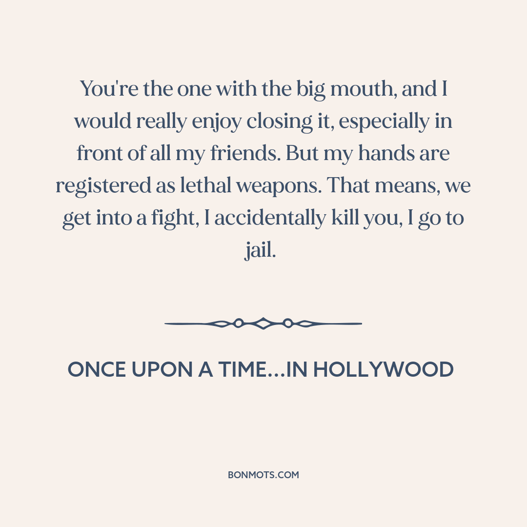 You're the one with the big mouth, and I would really enjoy closing it, especially in front of all my friends. But my hands are registered as lethal weapons. That means, we get into a fight, I accidentally kill you, I go to jail.