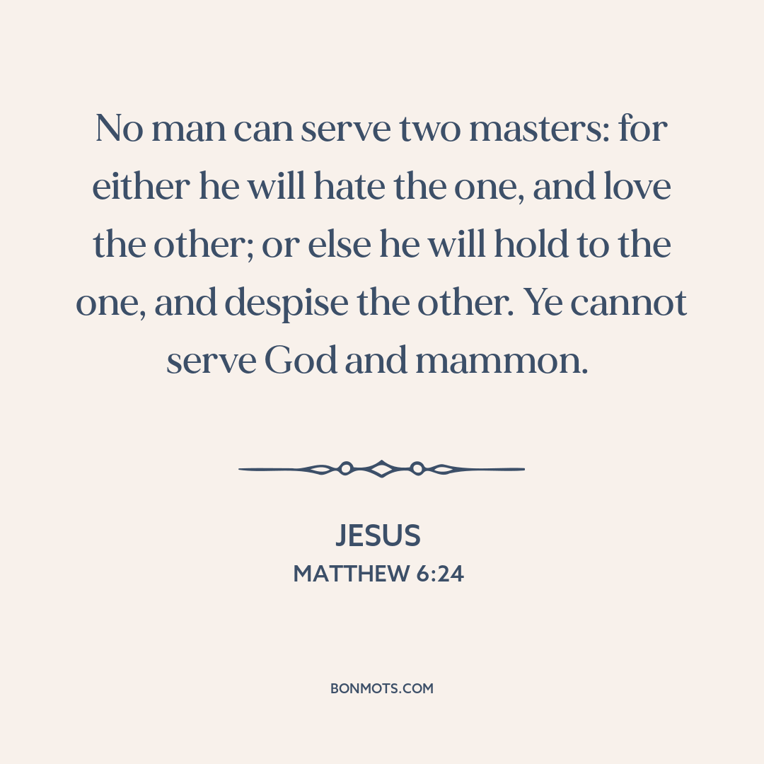 No man can serve two masters: for either he will hate the one, and love the other; or else he will hold to the one, and despise the other. Ye cannot serve God and mammon.