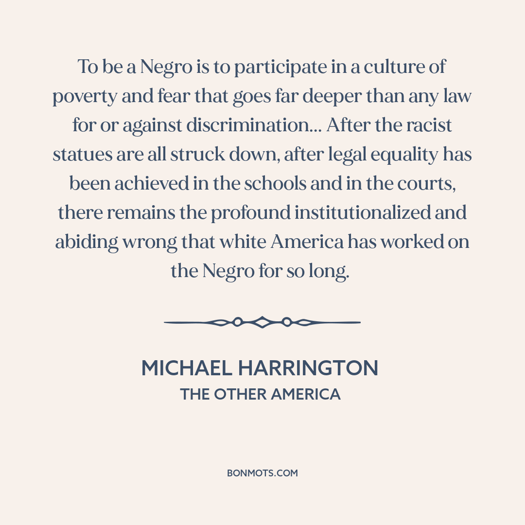 To be a Negro is to participate in a culture of poverty and fear that goes far deeper than any law for or against discrimination... After the racist statues are all struck down, after legal equality has been achieved in the schools and in the courts, there remains the profound institutionalized and abiding wrong that white America has worked on the Negro for so long.