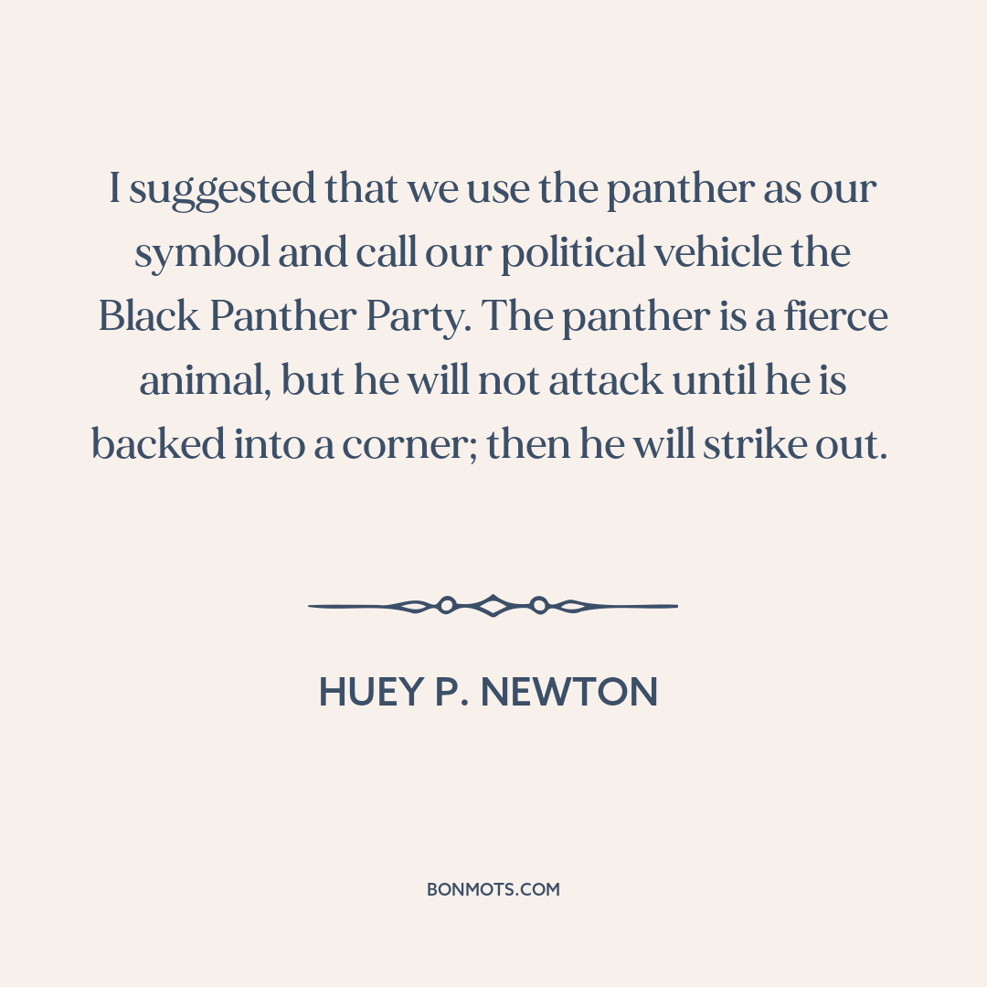 I suggested that we use the panther as our symbol and call our political vehicle the Black Panther Party. The panther is a fierce animal, but he will not attack until he is backed into a corner; then he will strike out.