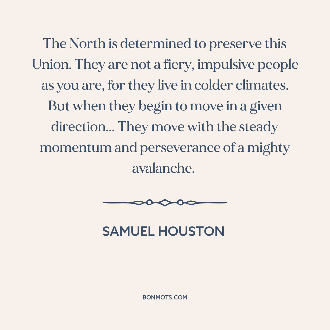 The North is determined to preserve this Union. They are not a fiery, impulsive people as you are, for they live in colder climates. But when they begin to move in a given direction... They move with the steady momentum and perseverance of a mighty avalanche.