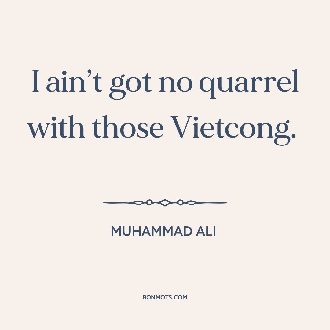 Ali, Muhammad. Quoted in "I Ain't Got No Quarrel with them Viet Cong." Written by Bob Orkland. The New York Times, 27 June 2017. Originally a press conference. 28 Apr. 1967, Louisville, KY, USA.