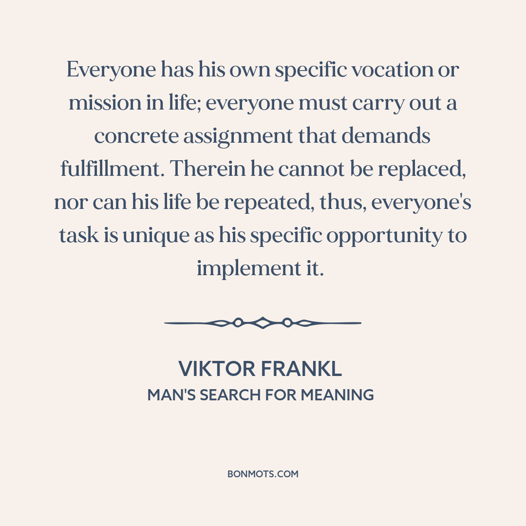 Everyone has his own specific vocation or mission in life; everyone must carry out a concrete assignment that demands fulfillment. Therein he cannot be replaced, nor can his life be repeated, thus, everyone's task is unique as his specific opportunity to implement it.