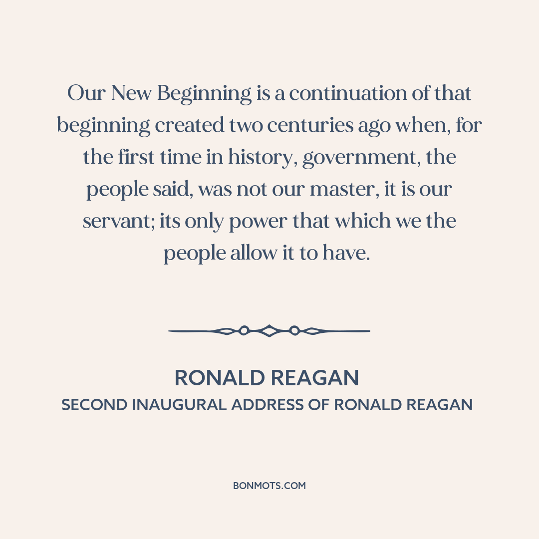 Our New Beginning is a continuation of that beginning created two centuries ago when, for the first time in history, government, the people said, was not our master, it is our servant; its only power that which we the people allow it to have.