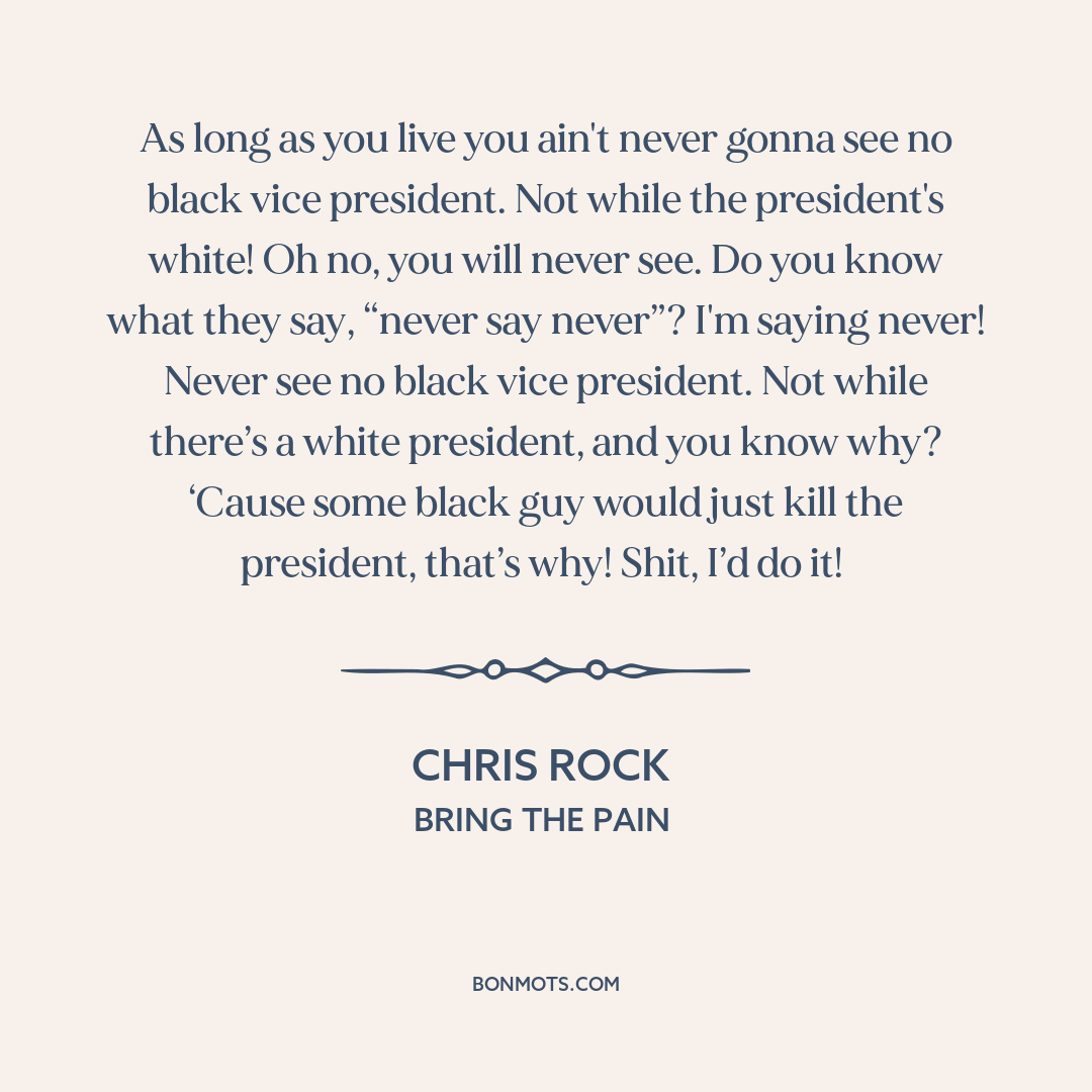 As long as you live you ain't never gonna see no black vice president. Not while the president's white! Oh no, you will never see. Do you know what they say, “never say never”? I'm saying never! Never see no black vice president. Not while there’s a white president, and you know why? ‘Cause some black guy would just kill the president, that’s why! Shit, I’d do it!