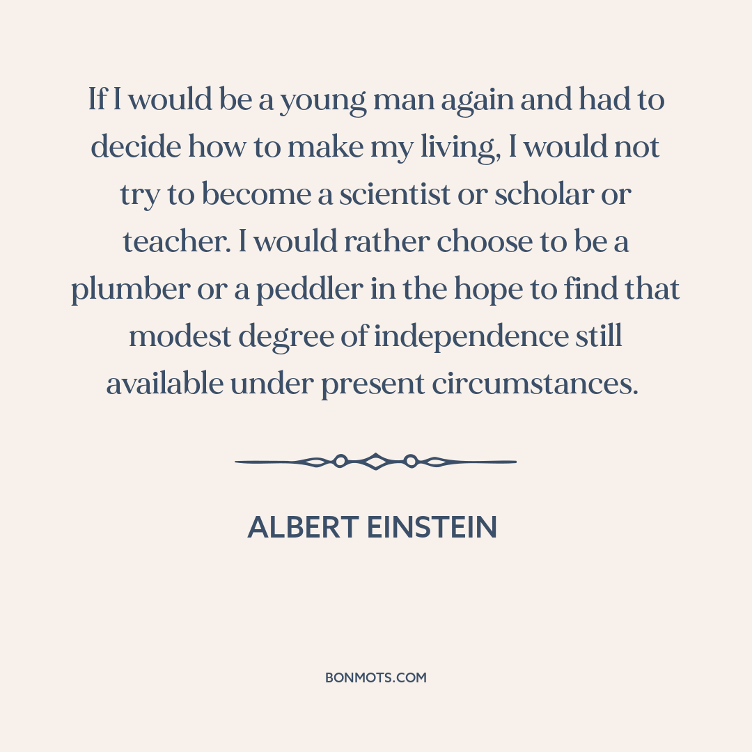 If I would be a young man again and had to decide how to make my living, I would not try to become a scientist or scholar or teacher. I would rather choose to be a plumber or a peddler in the hope to find that modest degree of independence still available under present circumstances.