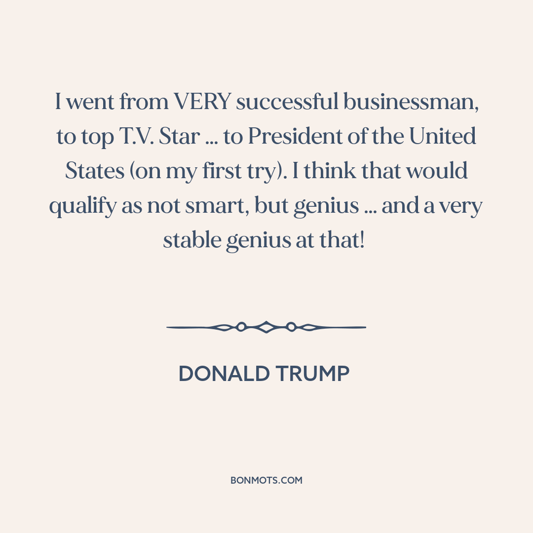 I went from VERY successful businessman, to top T.V. Star … to President of the United States (on my first try). I think that would qualify as not smart, but genius … and a very stable genius at that!