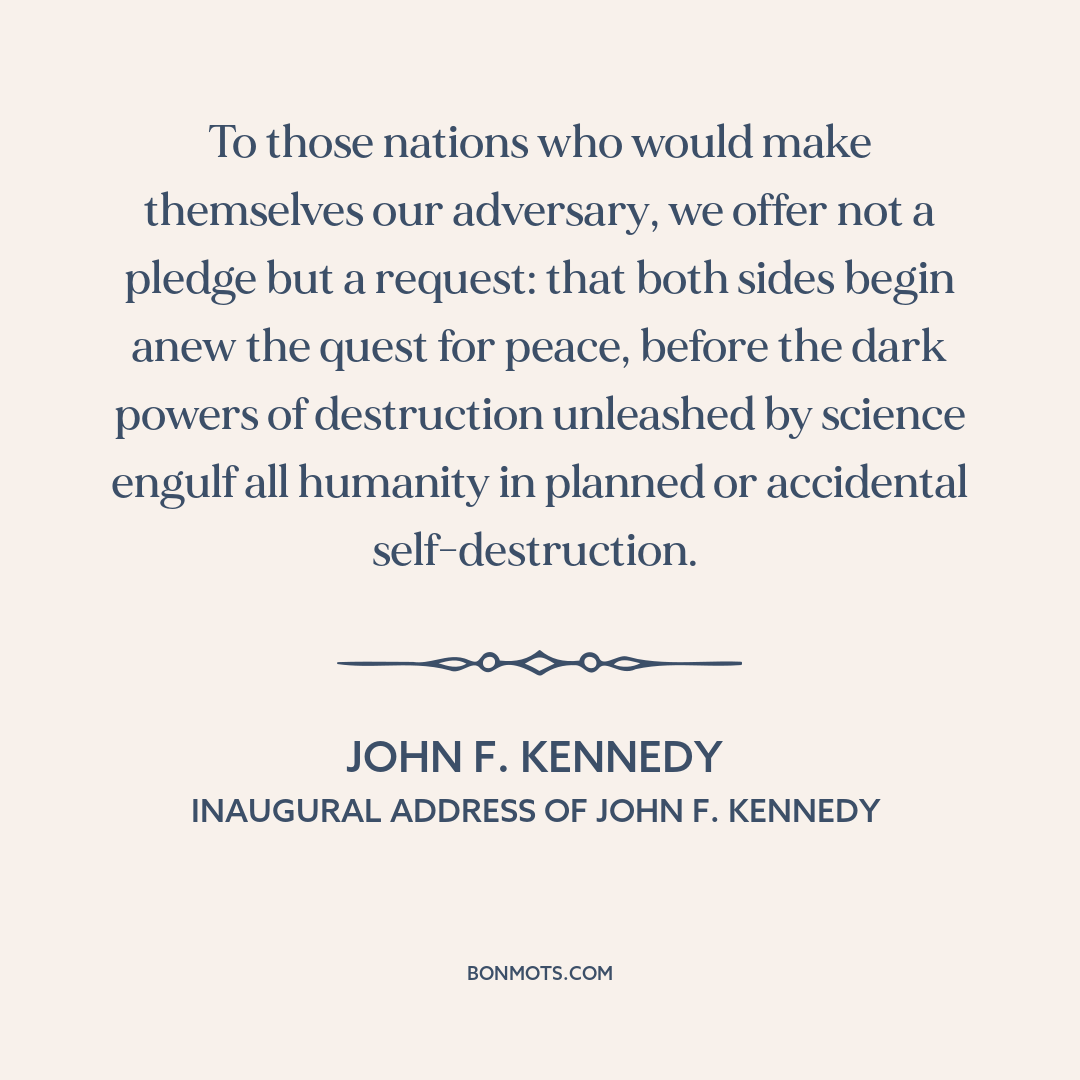 To those nations who would make themselves our adversary, we offer not a pledge but a request: that both sides begin anew the quest for peace, before the dark powers of destruction unleashed by science engulf all humanity in planned or accidental self-destruction.