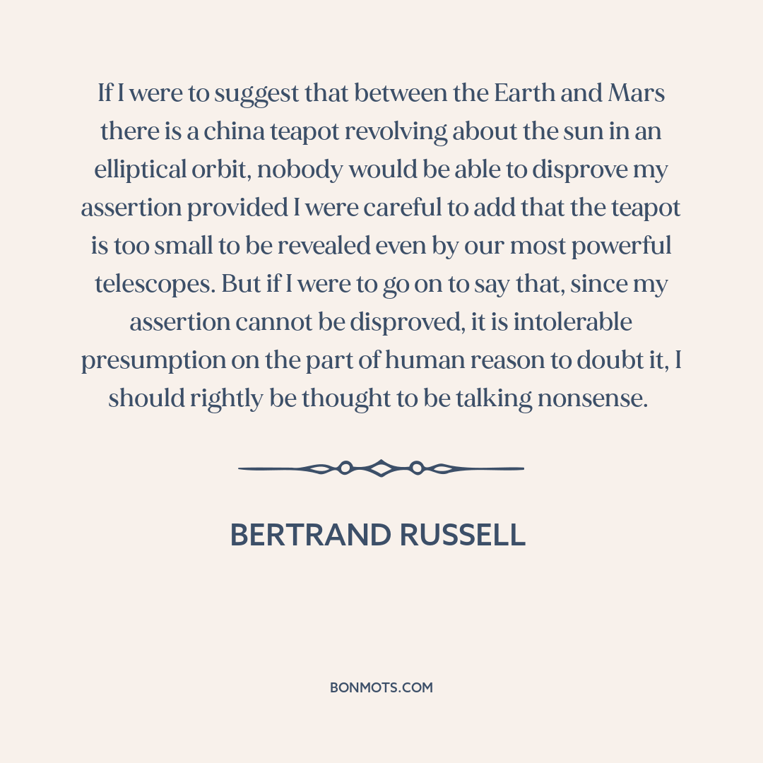 If I were to suggest that between the Earth and Mars there is a china teapot revolving about the sun in an elliptical orbit, nobody would be able to disprove my assertion provided I were careful to add that the teapot is too small to be revealed even by our most powerful telescopes. But if I were to go on to say that, since my assertion cannot be disproved, it is intolerable presumption on the part of human reason to doubt it, I should rightly be thought to be talking nonsense.