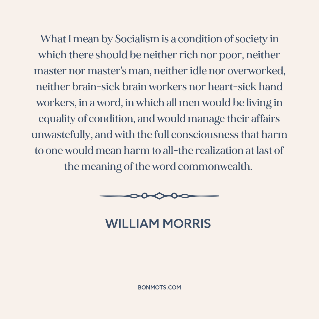 What I mean by Socialism is a condition of society in which there should be neither rich nor poor, neither master nor master's man, neither idle nor overworked, neither brain-sick brain workers nor heart-sick hand workers, in a word, in which all men would be living in equality of condition, and would manage their affairs unwastefully, and with the full consciousness that harm to one would mean harm to all-the realization at last of the meaning of the word commonwealth.