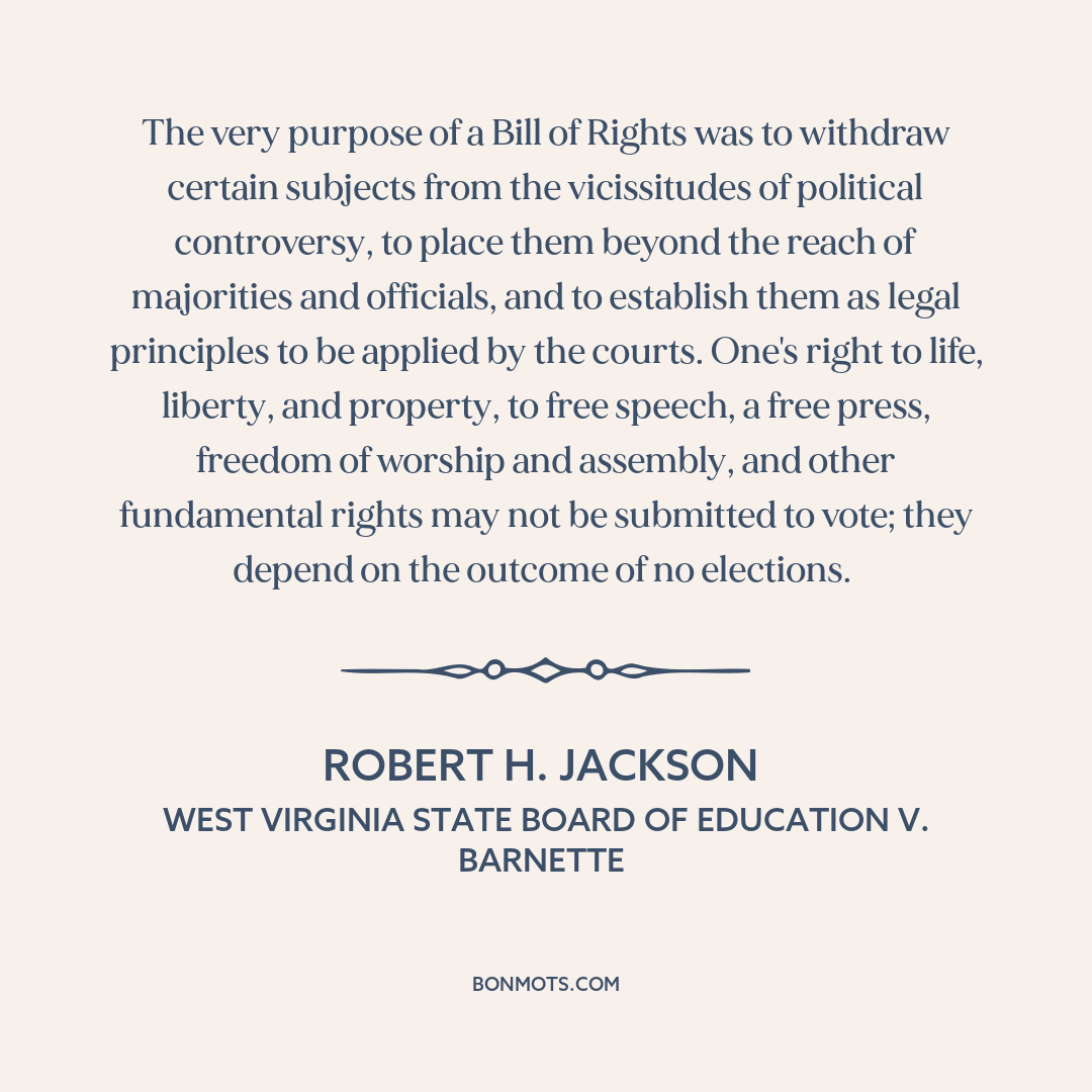The very purpose of a Bill of Rights was to withdraw certain subjects from the vicissitudes of political controversy, to place them beyond the reach of majorities and officials, and to establish them as legal principles to be applied by the courts. One's right to life, liberty, and property, to free speech, a free press, freedom of worship and assembly, and other fundamental rights may not be submitted to vote; they depend on the outcome of no elections.