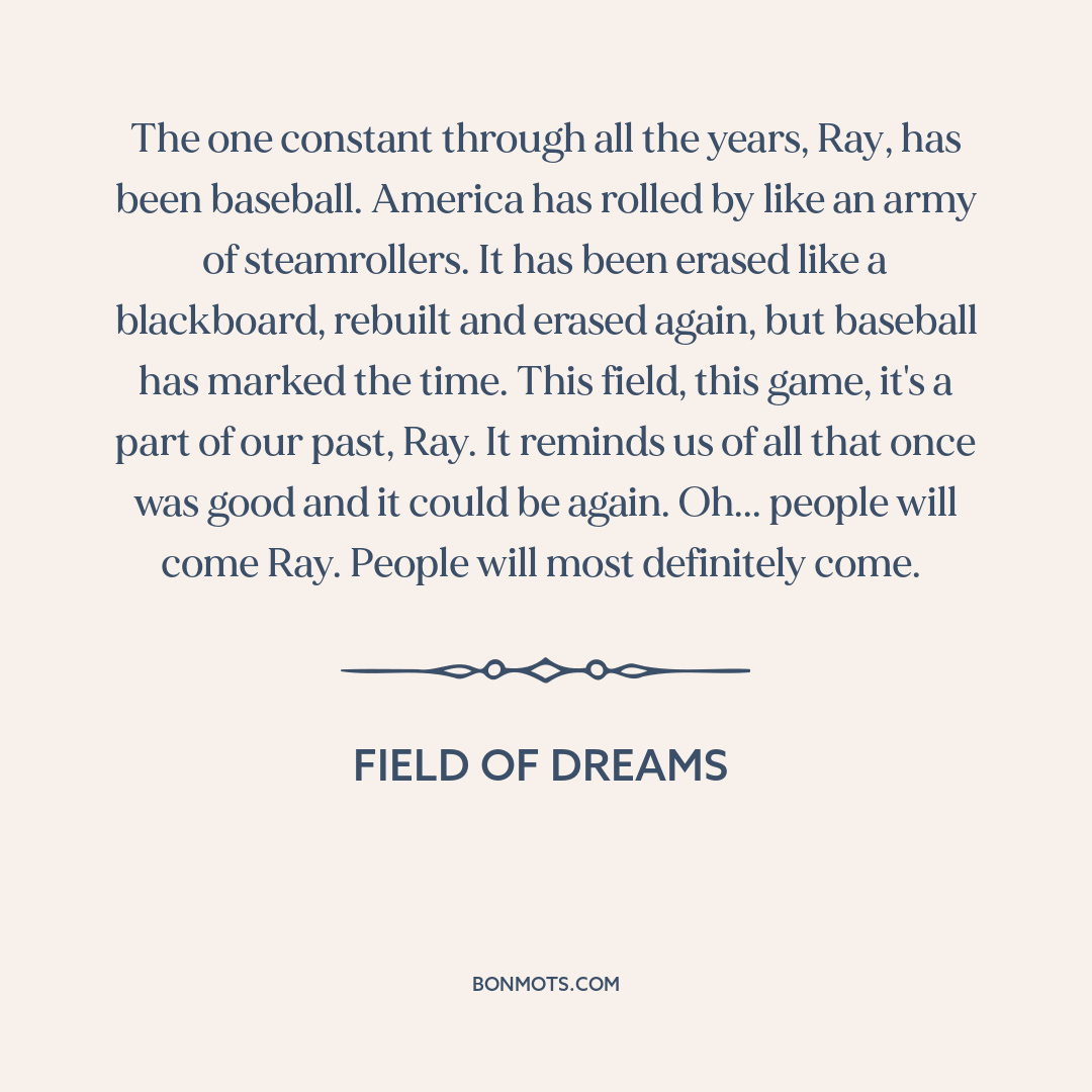 The one constant through all the years, Ray, has been baseball. America has rolled by like an army of steamrollers. It has been erased like a blackboard, rebuilt and erased again, but baseball has marked the time. This field, this game, it's a part of our past, Ray. It reminds us of all that once was good and it could be again. Oh... people will come Ray. People will most definitely come.