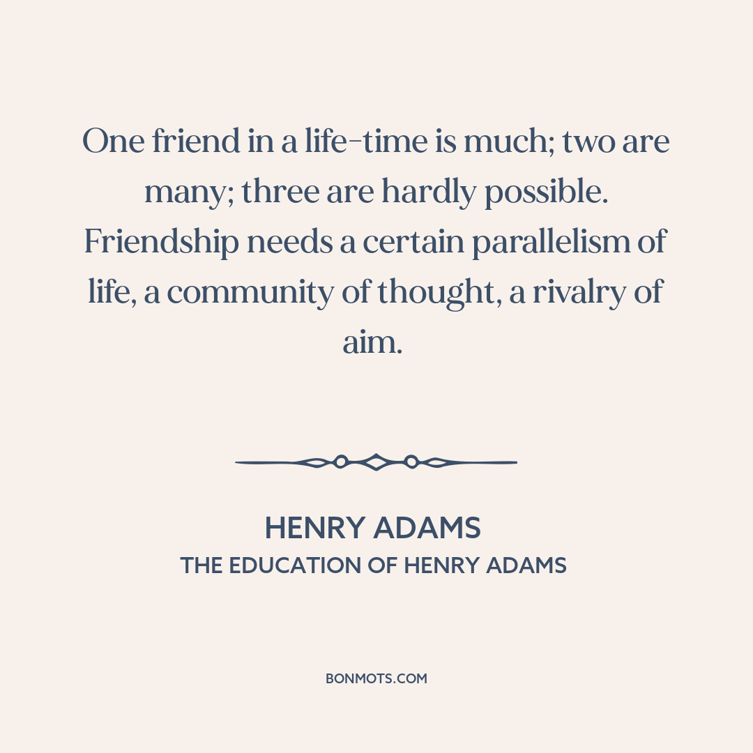 One friend in a life-time is much; two are many; three are hardly possible. Friendship needs a certain parallelism of life, a community of thought, a rivalry of aim.