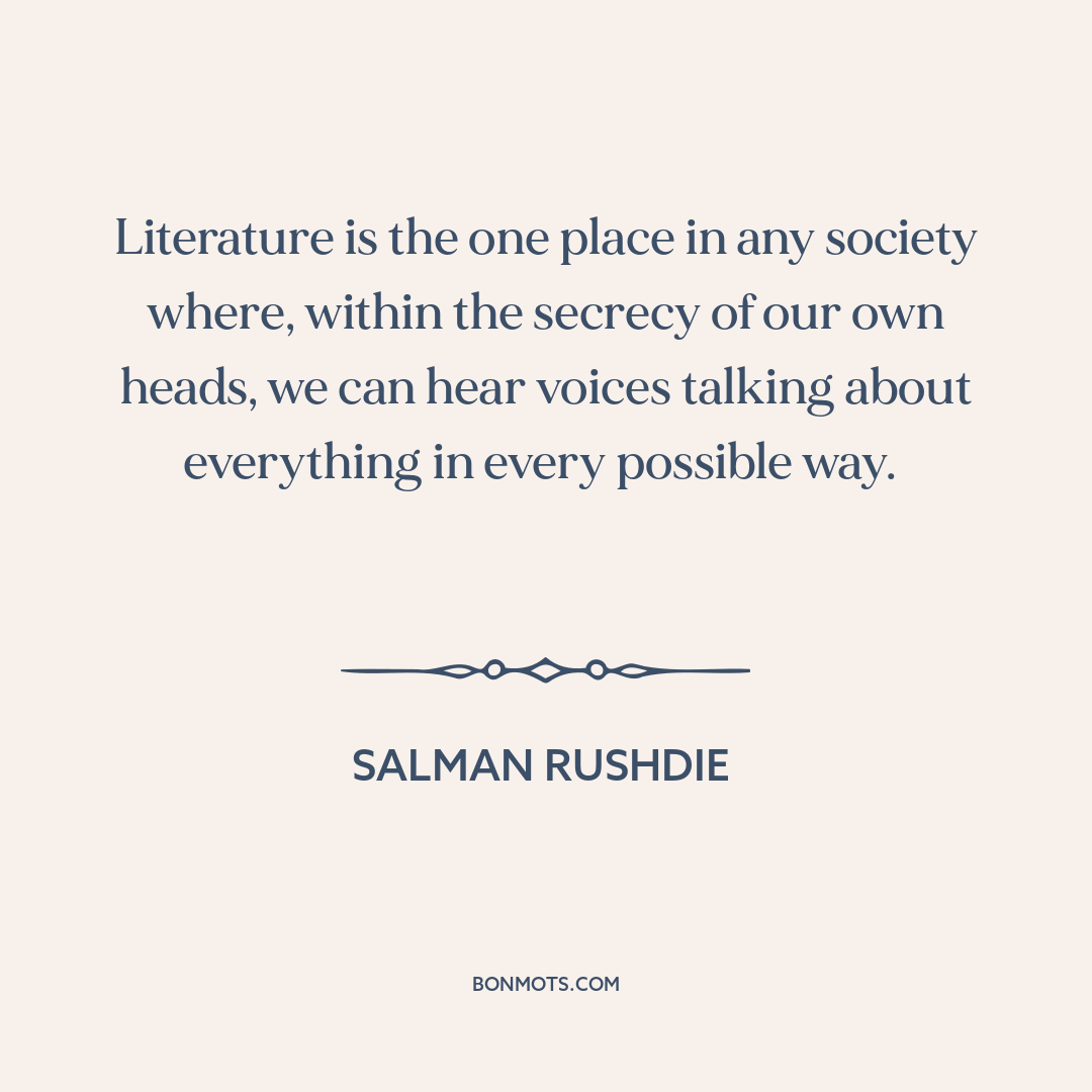 Literature is the one place in any society where, within the secrecy of our own heads, we can hear voices talking about everything in every possible way.