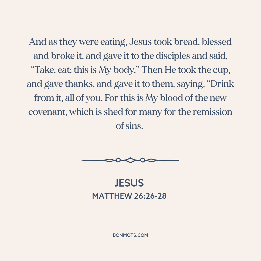 And as they were eating, Jesus took bread, blessed and broke it, and gave it to the disciples and said, “Take, eat; this is My body.” Then He took the cup, and gave thanks, and gave it to them, saying, “Drink from it, all of you. For this is My blood of the new covenant, which is shed for many for the remission of sins.