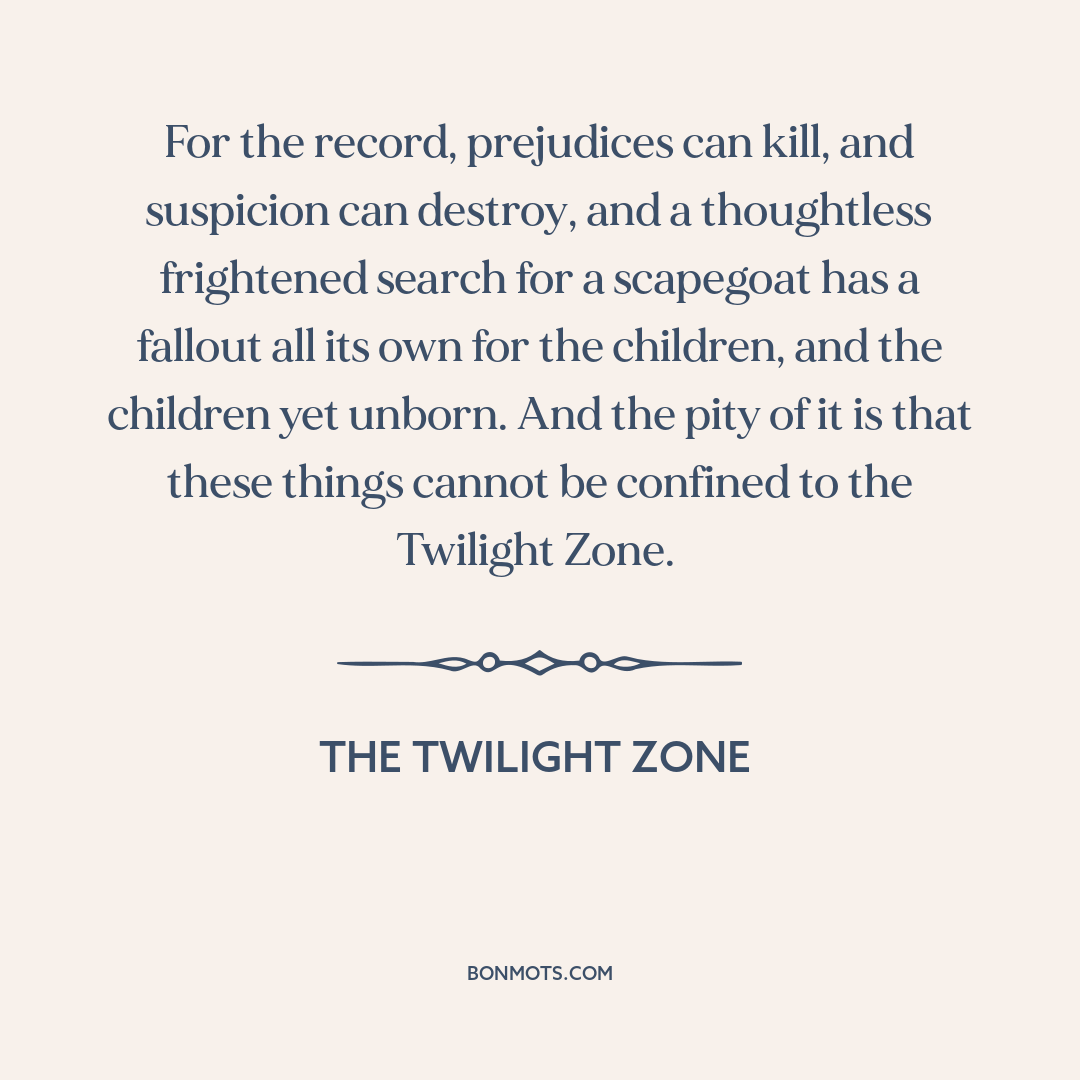 For the record, prejudices can kill, and suspicion can destroy, and a thoughtless frightened search for a scapegoat has a fallout all its own for the children, and the children yet unborn. And the pity of it is that these things cannot be confined to the Twilight Zone.