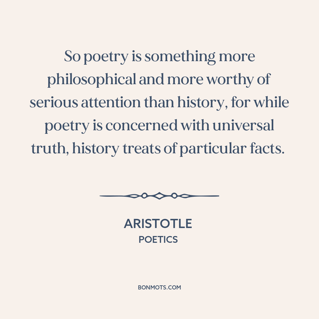 So poetry is something more philosophical and more worthy of serious attention than history, for while poetry is concerned with universal truth, history treats of particular facts.