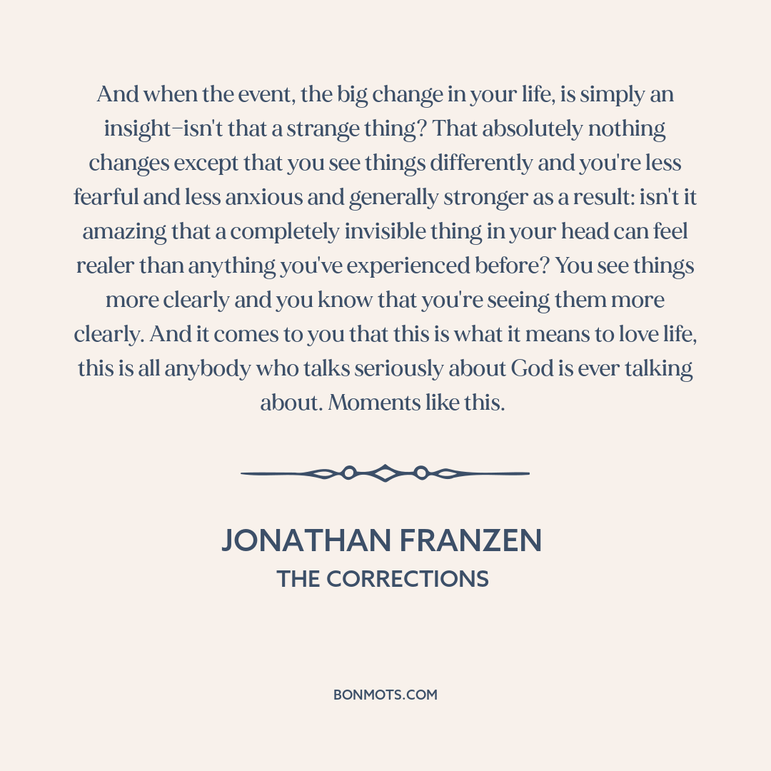 And when the event, the big change in your life, is simply an insight—isn't that a strange thing? That absolutely nothing changes except that you see things differently and you're less fearful and less anxious and generally stronger as a result: isn't it amazing that a completely invisible thing in your head can feel realer than anything you've experienced before? You see things more clearly and you know that you're seeing them more clearly. And it comes to you that this is what it means to love life, this is all anybody who talks seriously about God is ever talking about. Moments like this.