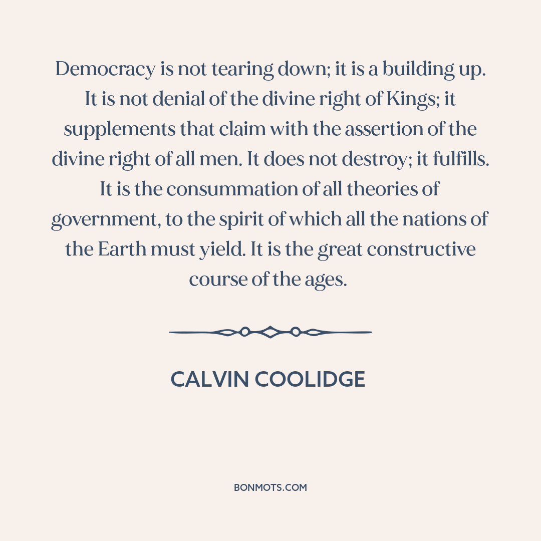 Democracy is not tearing down; it is a building up. It is not denial of the divine right of Kings; it supplements that claim with the assertion of the divine right of all men. It does not destroy; it fulfills. It is the consummation of all theories of government, to the spirit of which all the nations of the Earth must yield. It is the great constructive course of the ages.