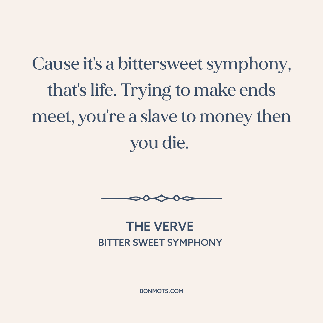 Cause it's a bittersweet symphony, that's life. Trying to make ends meet, you're a slave to money then you die.
