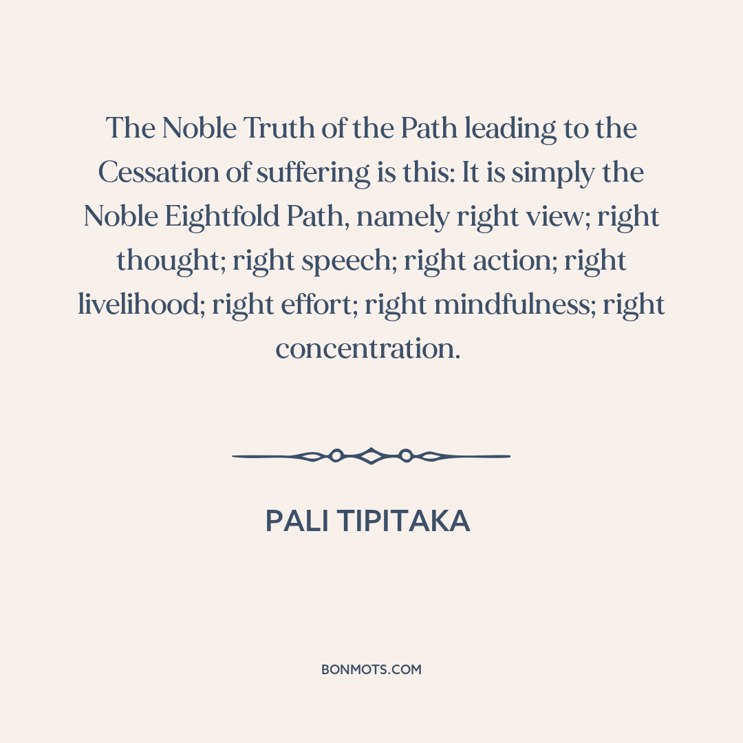 The Noble Truth of the Path leading to the Cessation of suffering is this: It is simply the Noble Eightfold Path, namely right view; right thought; right speech; right action; right livelihood; right effort; right mindfulness; right concentration.