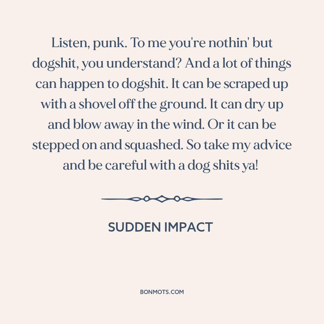 Listen, punk. To me you're nothin' but dogshit, you understand? And a lot of things can happen to dogshit. It can be scraped up with a shovel off the ground. It can dry up and blow away in the wind. Or it can be stepped on and squashed. So take my advice and be careful with a dog shits ya!