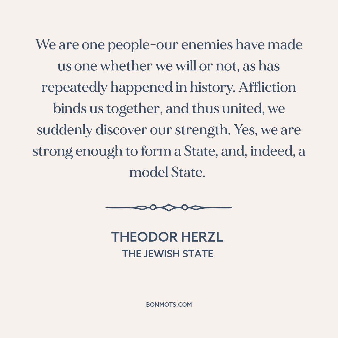 We are one people-our enemies have made us one whether we will or not, as has repeatedly happened in history. Affliction binds us together, and thus united, we suddenly discover our strength. Yes, we are strong enough to form a State, and, indeed, a model State.