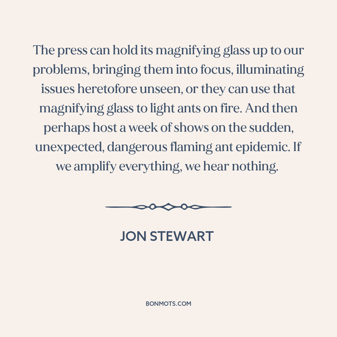 The press can hold its magnifying glass up to our problems, bringing them into focus, illuminating issues heretofore unseen, or they can use that magnifying glass to light ants on fire. And then perhaps host a week of shows on the sudden, unexpected, dangerous flaming ant epidemic. If we amplify everything, we hear nothing.
