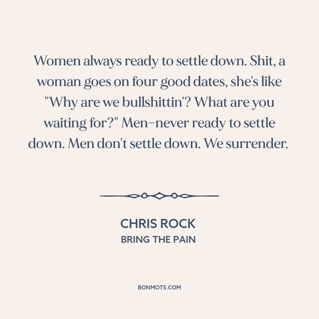 Women always ready to settle down. Shit, a woman goes on four good dates, she's like "Why are we bullshittin'? What are you waiting for?" Men—never ready to settle down. Men don't settle down. We surrender.