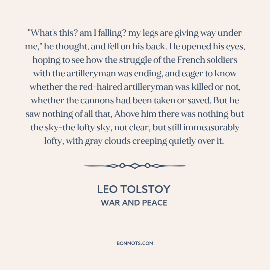 "What's this? am I falling? my legs are giving way under me," he thought, and fell on his back. He opened his eyes, hoping to see how the struggle of the French soldiers with the artilleryman was ending, and eager to know whether the red-haired artilleryman was killed or not, whether the cannons had been taken or saved. But he saw nothing of all that, Above him there was nothing but the sky-the lofty sky, not clear, but still immeasurably lofty, with gray clouds creeping quietly over it.
