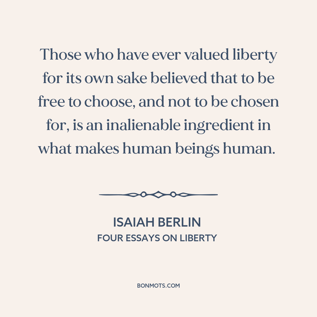 Those who have ever valued liberty for its own sake believed that to be free to choose, and not to be chosen for, is an inalienable ingredient in what makes human beings human.