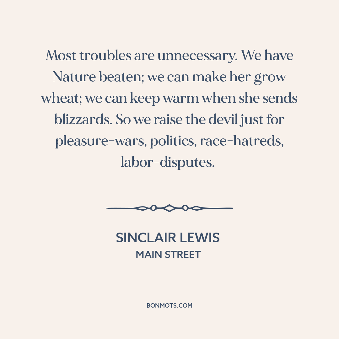 Most troubles are unnecessary. We have Nature beaten; we can make her grow wheat; we can keep warm when she sends blizzards. So we raise the devil just for pleasure-wars, politics, race-hatreds, labor-disputes.