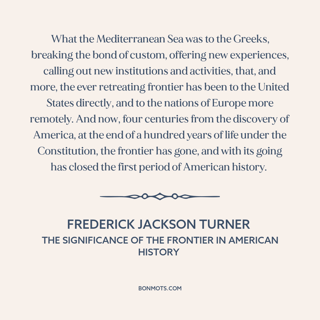 What the Mediterranean Sea was to the Greeks, breaking the bond of custom, offering new experiences, calling out new institutions and activities, that, and more, the ever retreating frontier has been to the United States directly, and to the nations of Europe more remotely. And now, four centuries from the discovery of America, at the end of a hundred years of life under the Constitution, the frontier has gone, and with its going has closed the first period of American history.