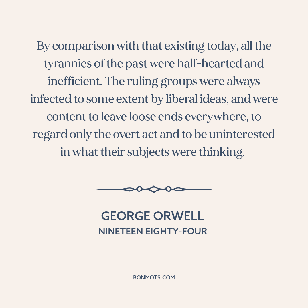 By comparison with that existing today, all the tyrannies of the past were half-hearted and inefficient. The ruling groups were always infected to some extent by liberal ideas, and were content to leave loose ends everywhere, to regard only the overt act and to be uninterested in what their subjects were thinking.