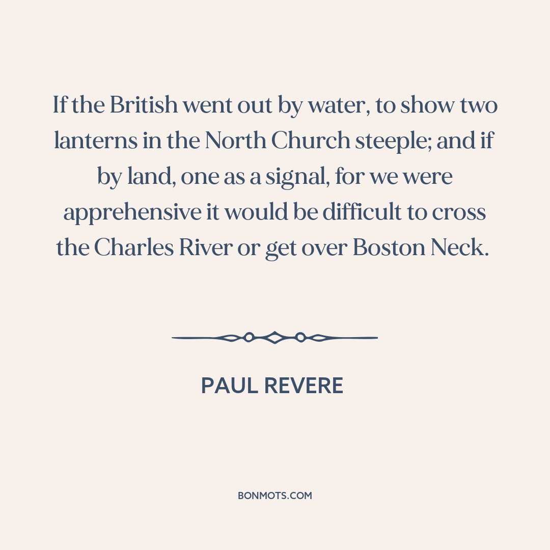 If the British went out by water, to show two lanterns in the North Church steeple; and if by land, one as a signal, for we were apprehensive it would be difficult to cross the Charles River or get over Boston Neck.