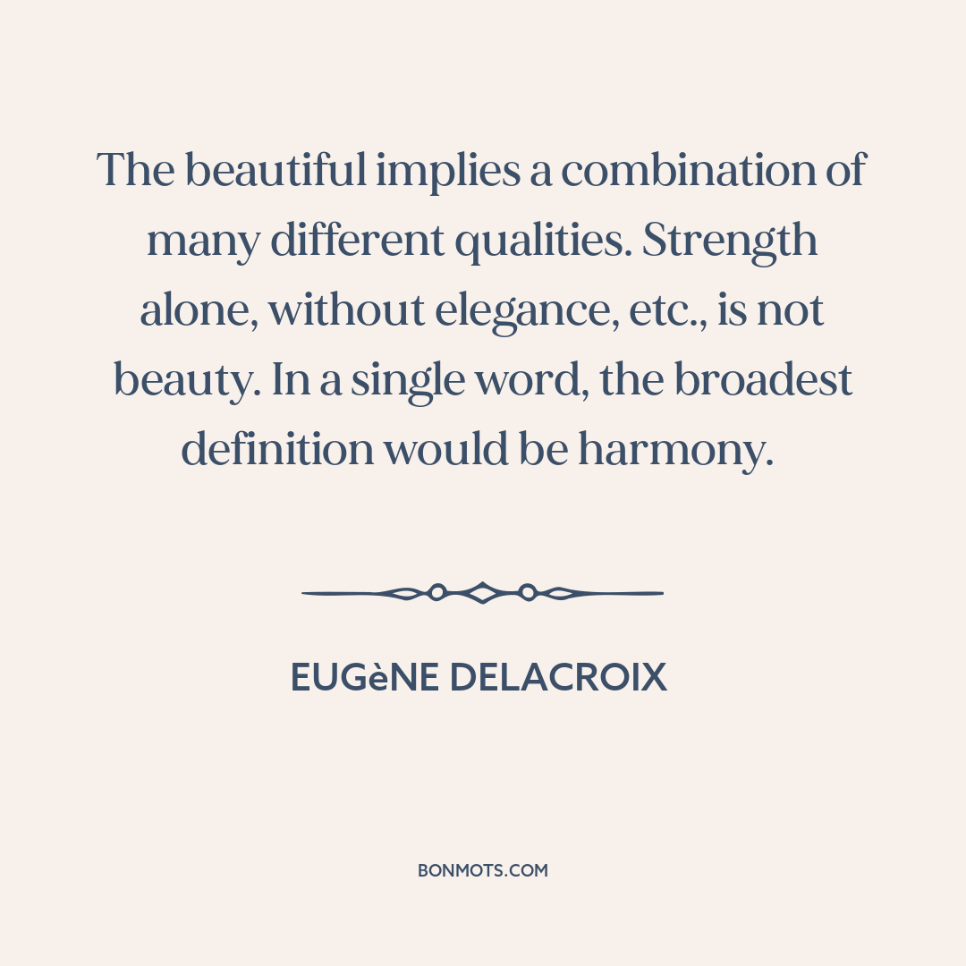 The beautiful implies a combination of many different qualities. Strength alone, without elegance, etc., is not beauty. In a single word, the broadest definition would be harmony.