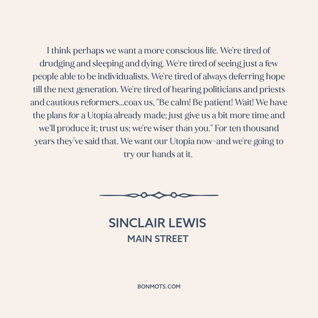 I think perhaps we want a more conscious life. We're tired of drudging and sleeping and dying. We're tired of seeing just a few people able to be individualists. We're tired of always deferring hope till the next generation. We're tired of hearing politicians and priests and cautious reformers...coax us, "Be calm! Be patient! Wait! We have the plans for a Utopia already made; just give us a bit more time and we’ll produce it; trust us; we're wiser than you." For ten thousand years they've said that. We want our Utopia now-and we're going to try our hands at it.