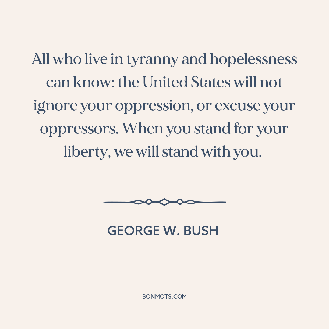 All who live in tyranny and hopelessness can know: the United States will not ignore your oppression, or excuse your oppressors. When you stand for your liberty, we will stand with you.