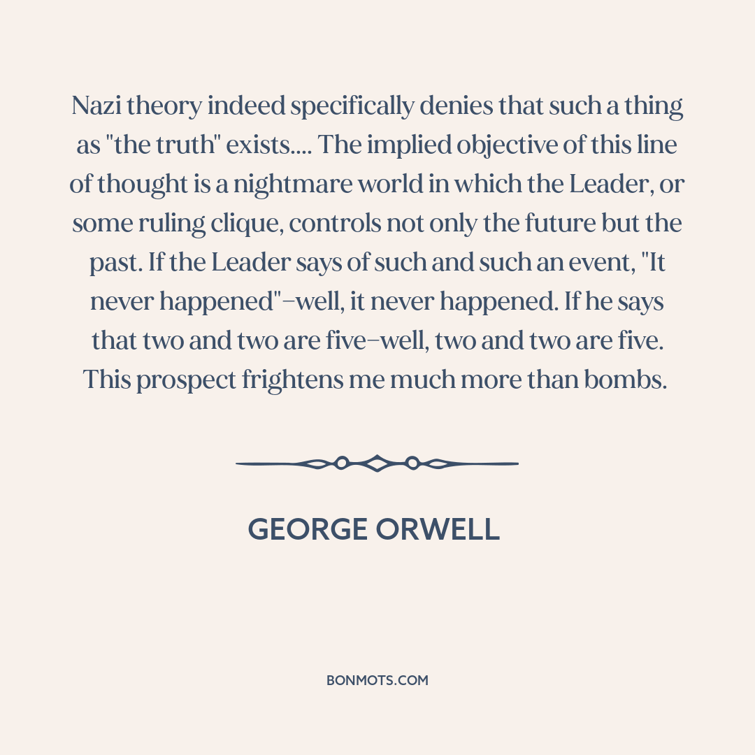Nazi theory indeed specifically denies that such a thing as "the truth" exists.... The implied objective of this line of thought is a nightmare world in which the Leader, or some ruling clique, controls not only the future but the past. If the Leader says of such and such an event, "It never happened"—well, it never happened. If he says that two and two are five—well, two and two are five. This prospect frightens me much more than bombs.
