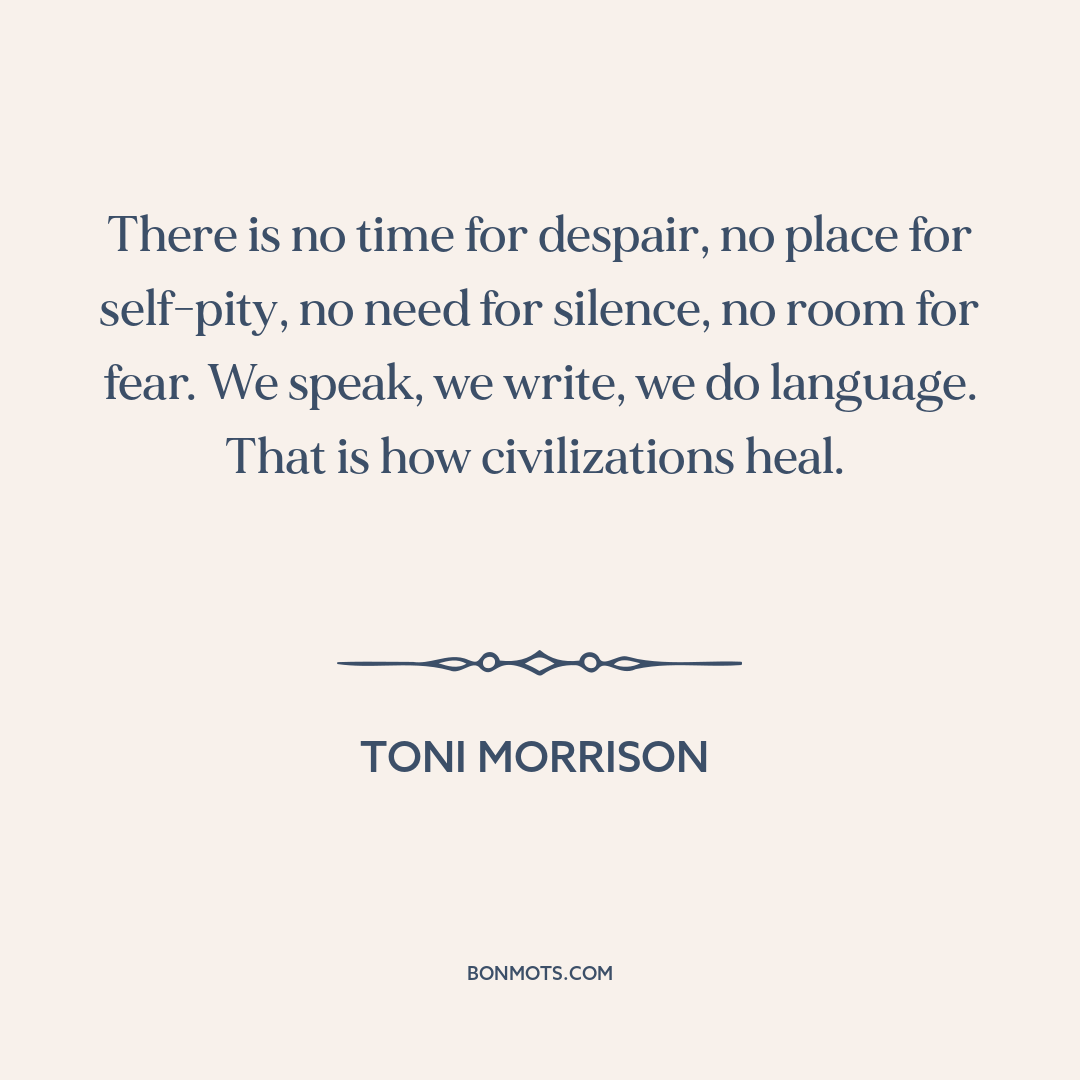 There is no time for despair, no place for self-pity, no need for silence, no room for fear. We speak, we write, we do language. That is how civilizations heal.